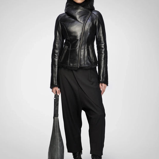 Black Matte Sheepskin Leather Jacket with Classic Collar