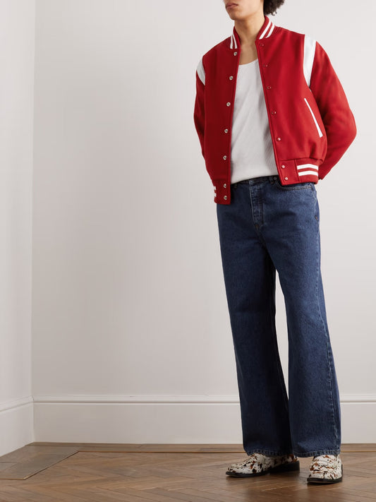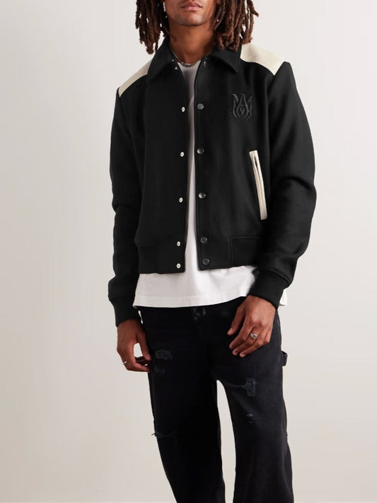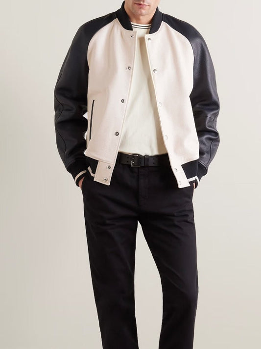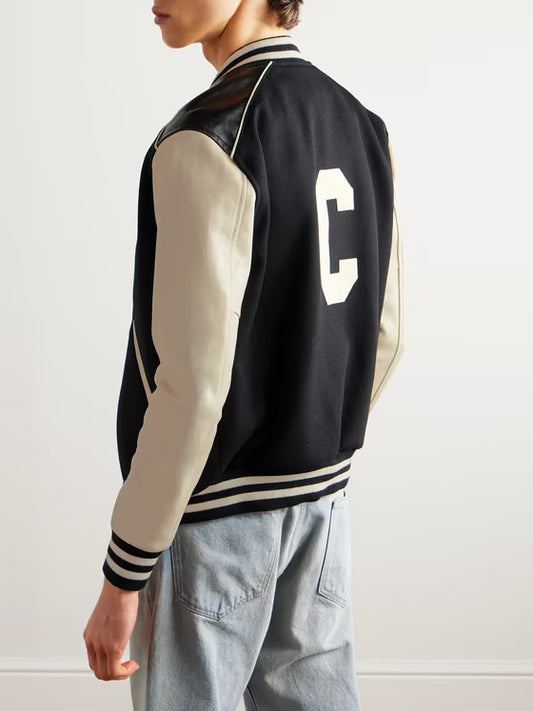 Black Wool-Blend Twill & Cream Leather Varsity Jacket