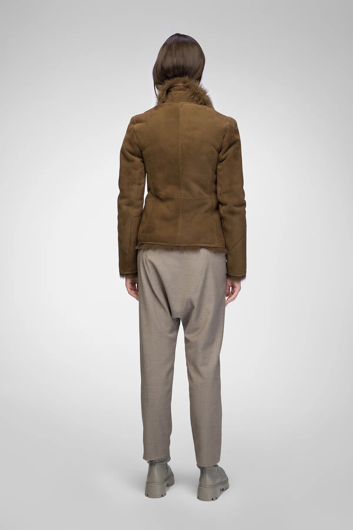 • Fit: Ensure that the jacket fits well. It should be snug but not too tight, allowing for layering underneath. Shearling can stretch a bit over time, so a slightly fitted look can work well.